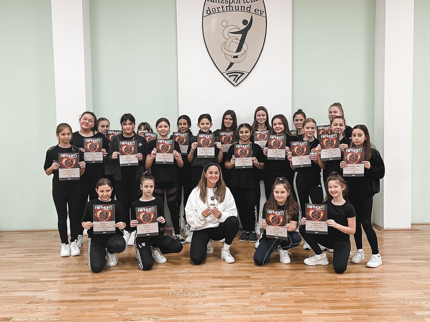 Die Gruppe erreichte den 3. Platz in der Kategorie Kids large Teams und präsentiert stolz, die in dieser Woche erhaltenen Urkunden und den Pokal 🏆