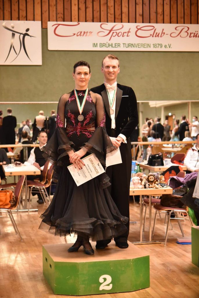 Martin Wiesner und Sandra Tchana Tchuinou starteten in der Hauptgruppe II D Standard. Im Feld von drei Paaren überzeugten die Beiden die Wertungsrichter und sind somit die Landesmeister 2021. Sandra schreibt: "Es waren leider nur 3 Paare am Start, aber wir haben uns trotzdem riesig gefreut nach 1,5 Jahren Turnierpause wegen Corona endlich wieder ein Turnier zu tanzen."