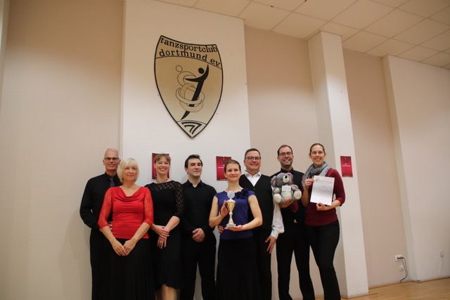 "Trotz eines kleinen Starterfeldes von nur 13 Paaren war das diesjährige Mannschaftsturnier der Breitensportler bestens besucht. Vier Dortmunder Paare traten bei guter Stimmung und sich stetig füllendem Saal gegen zwei spontan gebildete Tanzsportgemeinschaften, bestehend aus einem Team aus Witten und Neuss (zwei und zwei Paare) bzw. Lüdenscheid und Bochum (drei und zwei Paare) an. Sympathisch und zügig führte Jutta Sniehotta durch das Turnier, das zu der großen Freude aller Beteiligten letztlich mit nur 4,5 Punkten Vorsprung vom Dortmunder Team gewonnen werden konnte, gefolgt von der Lüdenscheider/Bochumer Kombinationsmannschaft auf Platz Zwei sowie dem Team aus Witten und Neuss."