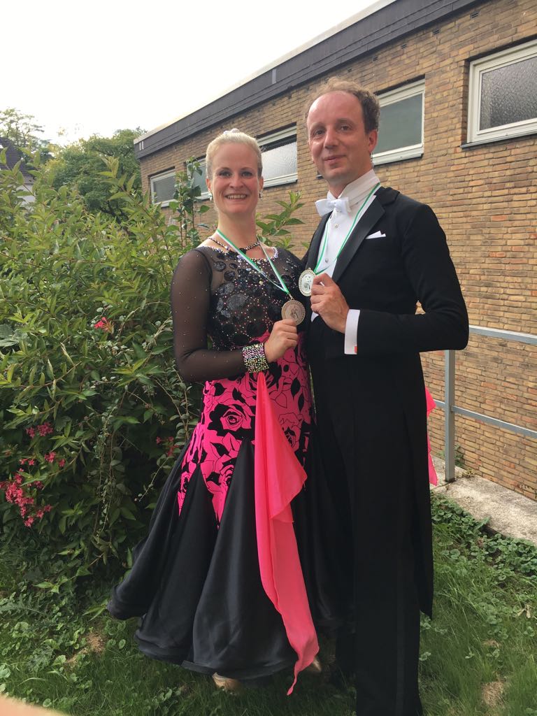 Doppelt erfolgreich präsentierten sich Peter Maass und Heike Schwiertz bei den Turnieren um den NRW-Pokal der SEN II B Standard bei der TSG Leverkusen. 11 Paare nahmen am Samstag am Turnier teil, Peter und Heike erreichten das Finale und beendeten das Turnier mit dem 5. Platz. Voller Motivation und Energie gingen die Beiden in neuem Outfit am nächsten Tag erneut an den Start (8 Paare) - und der neuerliche Einzug ins Finale gelang zu ihrer vollen Zufriedenheit. Hochzufrieden mit dem 2. Platz resümierte Heike: "Wir waren folgensicherer ... und haben mit viel mehr Spaß und Selbstbewusstsein ... getanzt."
