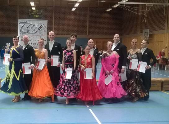 Im fernen Kaiserslautern feierten JENS/LEONIE EHRENTREICH einen prächtigen Wiedereinstieg ins Turniergeschehen: 1. von 7 Paaren der Sen I A Standard - nur zwei Einsen gaben sie ab! - Beim NRW-Pokal in Recklinghausen gewannen IGOR GETZ/DANA KOBER ganz überragend das Turnier der HGR A Latein (von 10)! - Und ebenfalls Platz 1 der A-Paare hieß es für CHRISTIAN KORNDÖRFER/JESSICA FENGLER im kombinierten 8-paarigen Sen I B/A Lateinturnier.