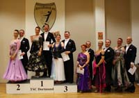 Schon am Samstag gab's für die Dortmunder Fans Grund zum Jubeln: Martin Ridder/Petra Kirsten und Olaf Wittka/Tanja Bracht, beide Sen II A Standard, präsentierten sich im 11-paarigen Starterfeld ganz hervorragend, qualifizier­ten sich klar fürs Finale und ertantzen hier Platz 4 und 5 - klasse!