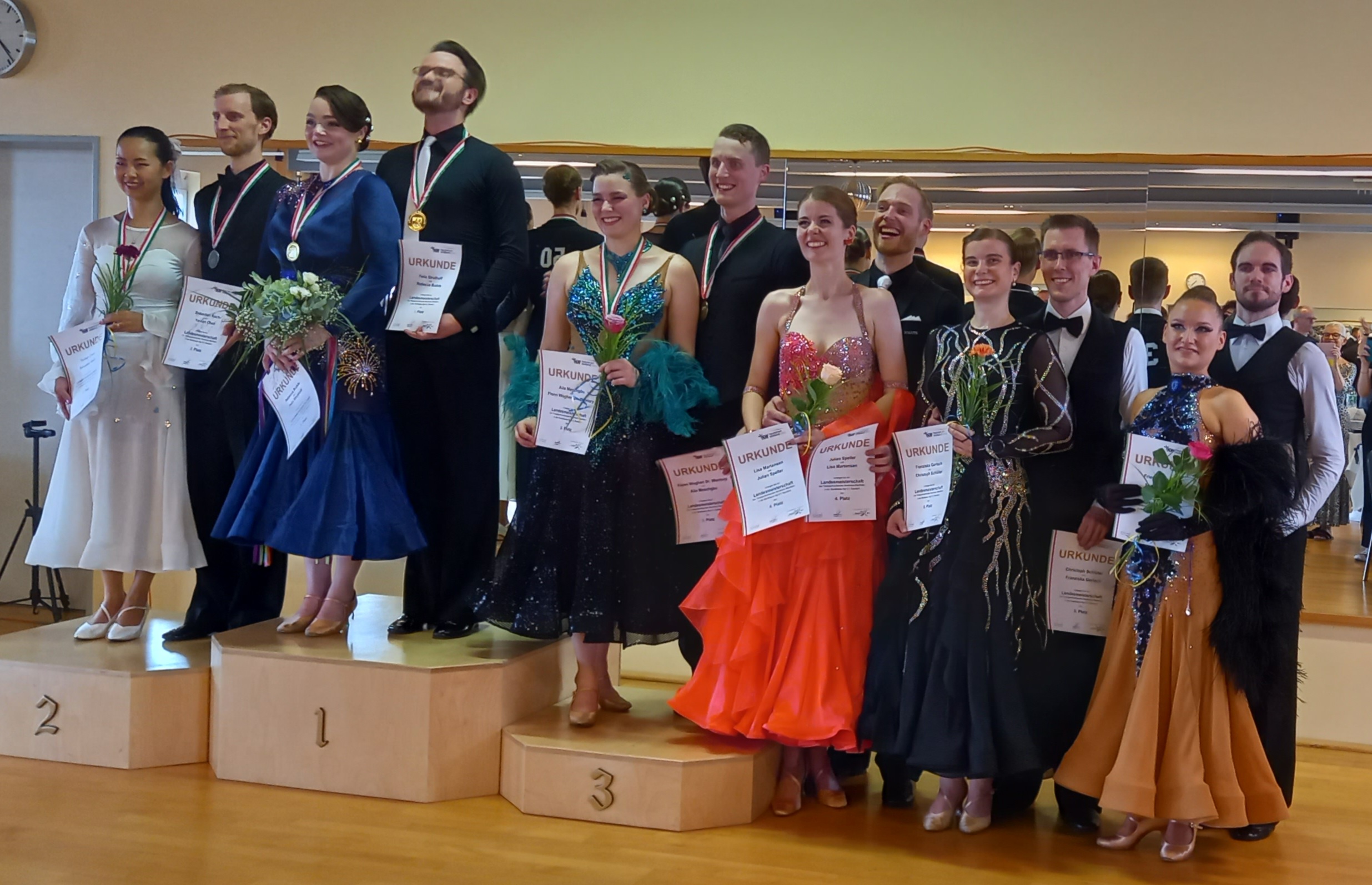 Im 10-paarigen Feld der HGR II C Standard starteten CHRISTOPH und FRANZISKA, präsentierten sich ganz hervorragend und erreichten sicher - mit voller Kreuzchenzahl! - das Finale. Wir Dortmunder Schlachtenbummler hätten sie dort gern ganz weit vorn gesehen , aber nur zwei der Wertungsrichter sahen das auch so... Am Ende war's der 5. Platz für Chris und Franzi, aber im Slowfox Platz 3! - Klasse!